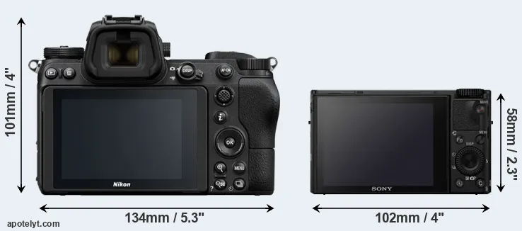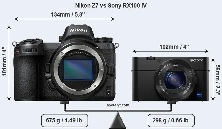The side-by-side display below illustrates the physical size and weight of the Nikon Z7 and the Sony RX100 IV. The two cameras are presented according to their relative size. Three consecutive views from the front, the top, and the rear side are shown. All size dimensions are rounded to the nearest millimeter.