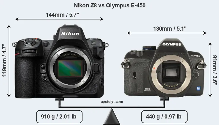 The physical size and weight of the Nikon Z8 and the Olympus E-450 are illustrated in the side-by-side display below. The two cameras are presented according to their relative size. Three consecutive perspectives from the front, the top, and the back are available. All width, height and depth dimensions are rounded to the nearest millimeter.