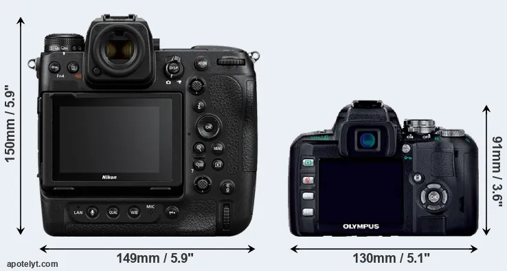 The side-by-side display below illustrates the physical size and weight of the Nikon Z9 and the Olympus E-400. The two cameras are presented according to their relative size. Three consecutive perspectives from the front, the top, and the back are available. All width, height and depth measures are rounded to the nearest millimeter.