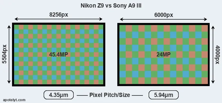 With 45.4MP, the Z9 offers a higher resolution than the A9 III (24MP), but the Z9 has smaller individual pixels (pixel pitch of 4.35μm versus 5.94μm for the A9 III). Moreover, the A9 III is a much more recent model (by 2 years) than the Z9, and its sensor will have benefitted from technological advances during this time that enhance the light gathering capacity of its pixels. Coming back to sensor resolution, it should be mentioned that the Z9 has no anti-alias filter installed, so that it can capture all the detail its sensor resolves.