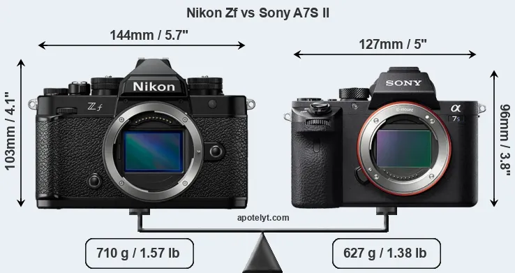 If the front view area (width x height) of the cameras is taken as an aggregate measure of their size, the Sony A7S II is notably smaller (18 percent) than the Nikon Zf. Moreover, the A7S II is markedly lighter (12 percent) than the Zf. In this context, it is worth noting that both cameras are splash and dust-proof and can, hence, be used in inclement weather conditions or harsh environments.
