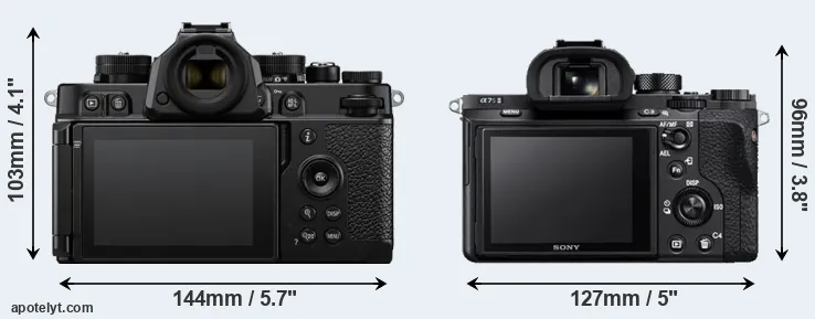 The side-by-side display below illustrates the physical size and weight of the Nikon Zf and the Sony A7S II. The two cameras are presented according to their relative size. Three consecutive views from the front, the top, and the rear side are shown. All width, height and depth dimensions are rounded to the nearest millimeter.