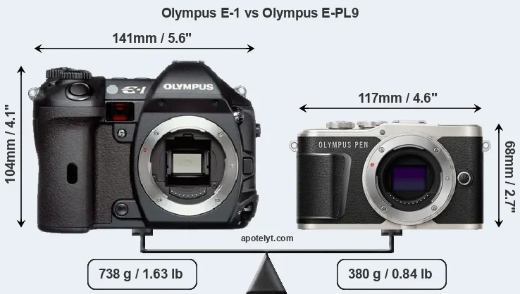 An illustration of the physical size and weight of the Olympus E-1 and the Olympus E-PL9 is provided in the side-by-side display below. The two cameras are presented according to their relative size. Three consecutive perspectives from the front, the top, and the back are available. All width, height and depth dimensions are rounded to the nearest millimeter.
