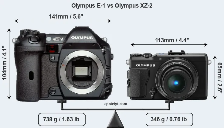 If the front view area (width x height) of the cameras is taken as an aggregate measure of their size, the Olympus XZ-2 is considerably smaller (50 percent) than the Olympus E-1. It is worth mentioning in this context that the E-1 is splash and dust resistant, while the XZ-2 does not feature any corresponding weather-sealing.