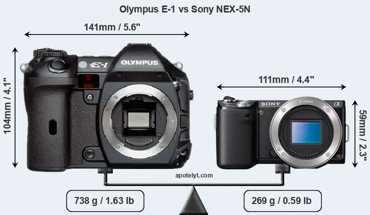 If the front view area (width x height) of the cameras is taken as an aggregate measure of their size, the Sony NEX-5N is considerably smaller (55 percent) than the Olympus E-1. Moreover, the NEX-5N is substantially lighter (64 percent) than the E-1. It is worth mentioning in this context that the E-1 is splash and dust resistant, while the NEX-5N does not feature any corresponding weather-sealing.