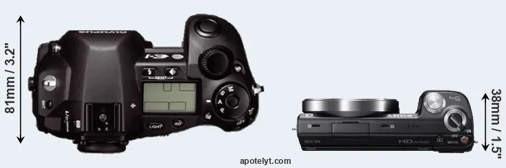 The physical size and weight of the Olympus E-1 and the Sony NEX-5N are illustrated in the side-by-side display below. The two cameras are presented according to their relative size. Three consecutive views from the front, the top, and the rear side are shown. All width, height and depth dimensions are rounded to the nearest millimeter.