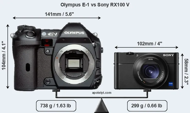 The above size and weight comparisons are to some extent incomplete and possibly misleading, as the RX100 V has a lens built in, whereas the E-1 is an interchangeable lens camera that requires a separate lens. Attaching the latter will add extra weight and bulk to the setup. You can compare the optics available for the E-1 and their specifications in the Four Thirds Lens Catalog.