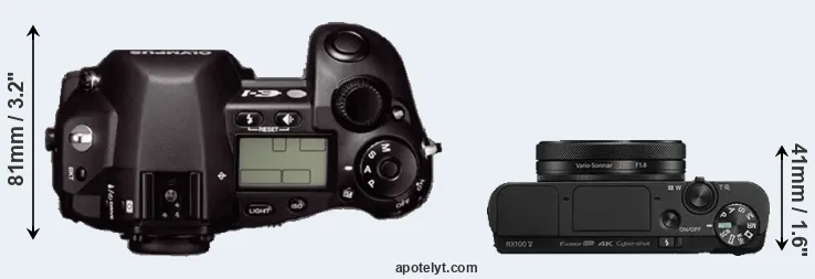 If the front view area (width x height) of the cameras is taken as an aggregate measure of their size, the Sony RX100 V is considerably smaller (60 percent) than the Olympus E-1. It is worth mentioning in this context that the E-1 is splash and dust resistant, while the RX100 V does not feature any corresponding weather-sealing.