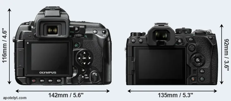 The above size and weight comparisons are to some extent incomplete since they do not consider the interchangeable lenses that both of these cameras require. Both cameras have similarly sized sensors, but DSLRs have a larger flange-to-focal plane distance than mirrorless cameras, which imposes contraints on the optical engineering process and generally leads to bigger and heavier lenses. You can compare the optics available for the two cameras in the Four Thirds Lens Catalog (E-3) and the Micro Four Thirds Lens Catalog (OM-1). Mirrorless cameras, such as the OM-1, have moreover the advantage that they can use many lenses from other systems via adapters, as they have a relatively short flange to focal plane distance.