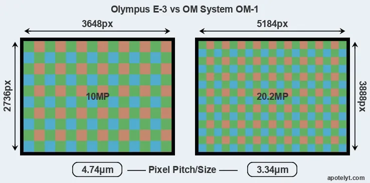 While the two cameras under review share the same sensor size, the OM-1 offers a higher resolution of 20.2 megapixels, compared with 10 MP of the E-3. This megapixels advantage translates into a 42 percent gain in linear resolution. On the other hand, these sensor specs imply that the OM-1 has a higher pixel density and a smaller size of the individual pixel (with a pixel pitch of 3.34μm versus 4.74μm for the E-3). However, it should be noted that the OM-1 is much more recent (by 14 years and 4 months) than the E-3, and its sensor will have benefitted from technological advances during this time that compensate for the smaller pixel size. Coming back to sensor resolution, it should be mentioned that the OM-1 has no anti-alias filter installed, so that it can capture all the detail its sensor resolves.