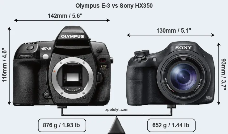 An illustration of the physical size and weight of the Olympus E-3 and the Sony HX350 is provided in the side-by-side display below. The two cameras are presented according to their relative size. Three consecutive perspectives from the front, the top, and the back are available. All size dimensions are rounded to the nearest millimeter.