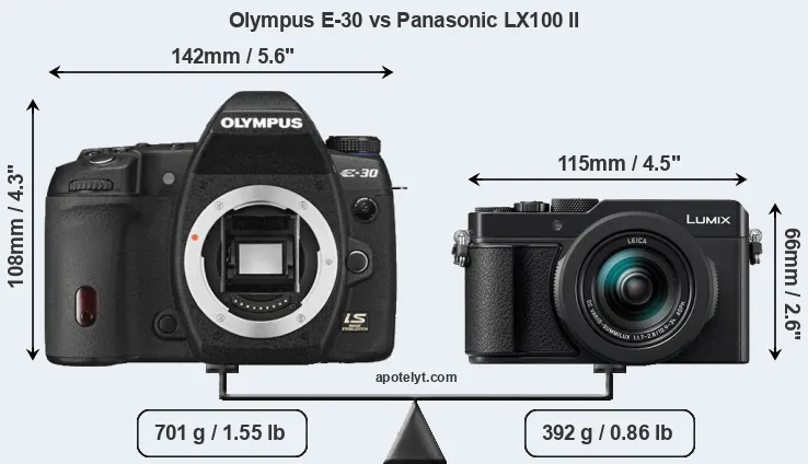 The above size and weight comparisons are to some extent incomplete and possibly misleading, as the LX100 II has a lens built in, whereas the E-30 is an interchangeable lens camera that requires a separate lens. Attaching the latter will add extra weight and bulk to the setup. You can compare the optics available for the E-30 and their specifications in the Four Thirds Lens Catalog.