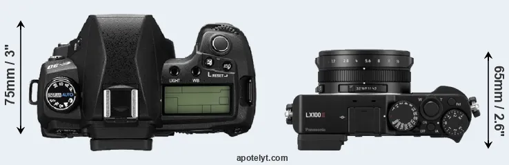 If the front view area (width x height) of the cameras is taken as an aggregate measure of their size, the Panasonic LX100 II is considerably smaller (51 percent) than the Olympus E-30. In this context, it is worth noting that neither the E-30 nor the LX100 II are weather-sealed.