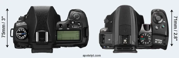 The physical size and weight of the Olympus E-30 and the Pentax K-30 are illustrated in the side-by-side display below. The two cameras are presented according to their relative size. Three consecutive views from the front, the top, and the rear side are shown. All width, height and depth dimensions are rounded to the nearest millimeter.