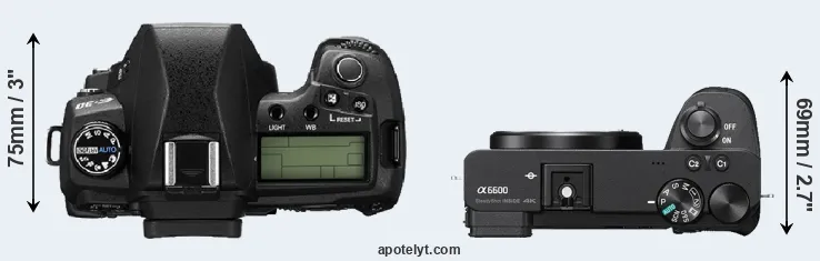 The physical size and weight of the Olympus E-30 and the Sony A6600 are illustrated in the side-by-side display below. The two cameras are presented according to their relative size. Three consecutive views from the front, the top, and the rear side are shown. All width, height and depth measures are rounded to the nearest millimeter.