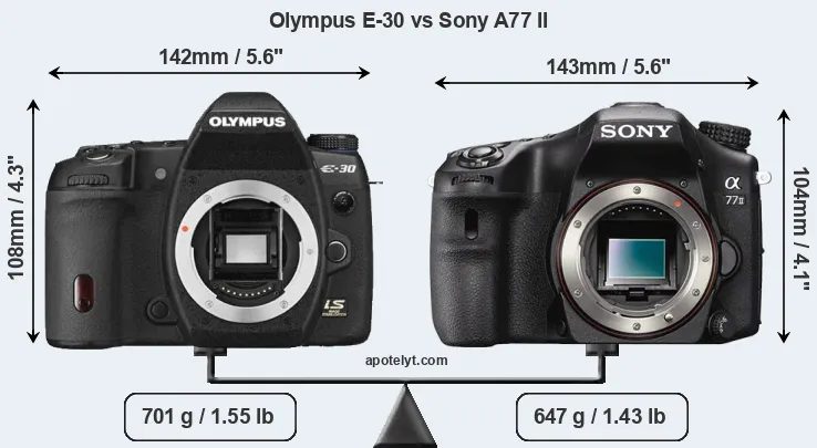 If the front view area (width x height) of the cameras is taken as an aggregate measure of their size, the Sony A77 II is somewhat smaller (3 percent) than the Olympus E-30. Moreover, the A77 II is markedly lighter (8 percent) than the E-30. It is noteworthy in this context that the A77 II is splash and dust-proof, while the E-30 does not feature any corresponding weather-sealing.