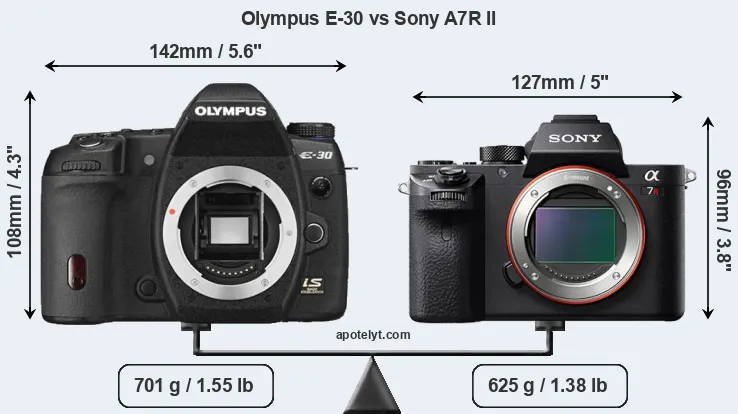 The physical size and weight of the Olympus E-30 and the Sony A7R II are illustrated in the side-by-side display below. The two cameras are presented according to their relative size. Three consecutive views from the front, the top, and the rear side are shown. All width, height and depth measures are rounded to the nearest millimeter.