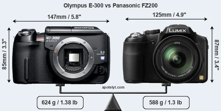 An illustration of the physical size and weight of the Olympus E-300 and the Panasonic FZ200 is provided in the side-by-side display below. The two cameras are presented according to their relative size. Three consecutive views from the front, the top, and the rear side are shown. All width, height and depth measures are rounded to the nearest millimeter.