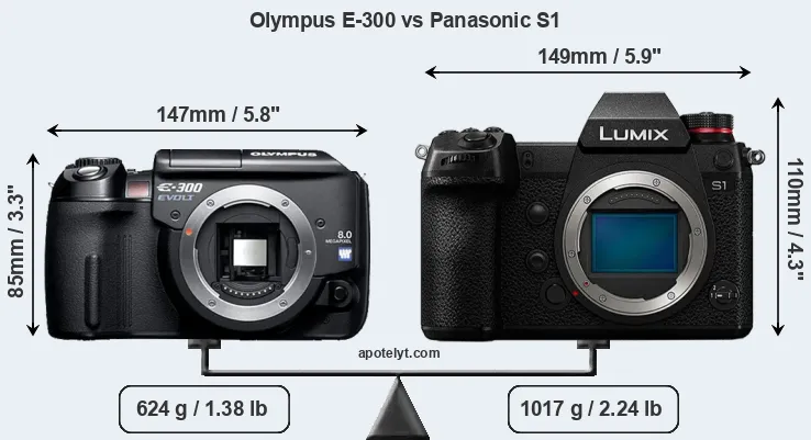 If the front view area (width x height) of the cameras is taken as an aggregate measure of their size, the Panasonic S1 is notably larger (31 percent) than the Olympus E-300. Moreover, the S1 is substantially heavier (63 percent) than the E-300. It is noteworthy in this context that the S1 is splash and dust-proof, while the E-300 does not feature any corresponding weather-sealing.