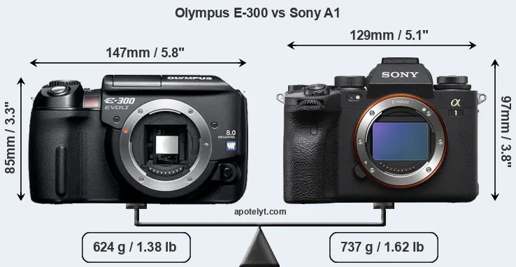 If the front view area (width x height) of the cameras is taken as an aggregate measure of their size, the Olympus E-300 and the Sony A1 are of equal size. However, the A1 is markedly heavier (18 percent) than the E-300. It is noteworthy in this context that the A1 is splash and dust-proof, while the E-300 does not feature any corresponding weather-sealing.