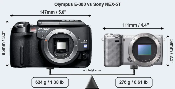 An illustration of the physical size and weight of the Olympus E-300 and the Sony NEX-5T is provided in the side-by-side display below. The two cameras are presented according to their relative size. Three successive views from the front, the top, and the rear are shown. All width, height and depth dimensions are rounded to the nearest millimeter.