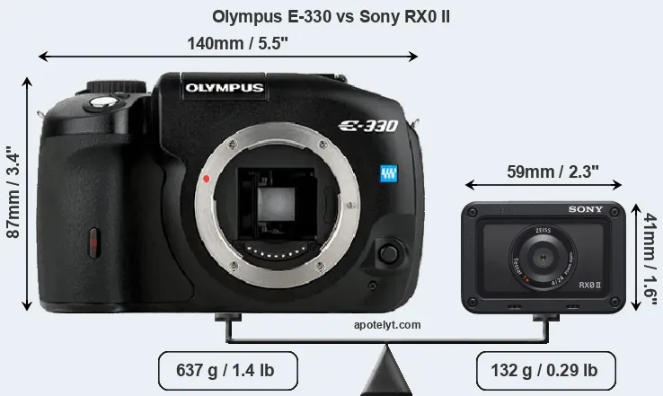 The side-by-side display below illustrates the physical size and weight of the Olympus E-330 and the Sony RX0 II. The two cameras are presented according to their relative size. Three consecutive views from the front, the top, and the rear side are shown. All width, height and depth dimensions are rounded to the nearest millimeter.