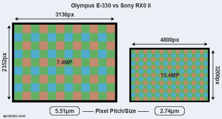 Despite having a smaller sensor, the RX0 II offers a higher resolution of 15.4 megapixels, compared with 7.4 MP of the E-330. This megapixels advantage comes at the cost of a higher pixel density and a smaller size of the individual pixel (with a pixel pitch of 2.74μm versus 5.51μm for the E-330). However, it should be noted that the RX0 II is much more recent (by 13 years and 2 months) than the E-330, and its sensor will have benefitted from technological advances during this time that make it possible to gather light more efficiently.