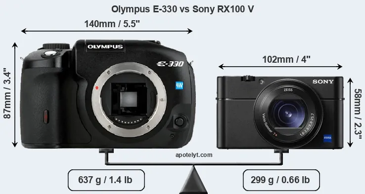 The above size and weight comparisons are to some extent incomplete and possibly misleading, as the RX100 V has a lens built in, whereas the E-330 is an interchangeable lens camera that requires a separate lens. Attaching the latter will add extra weight and bulk to the setup. You can compare the optics available for the E-330 and their specifications in the Four Thirds Lens Catalog.