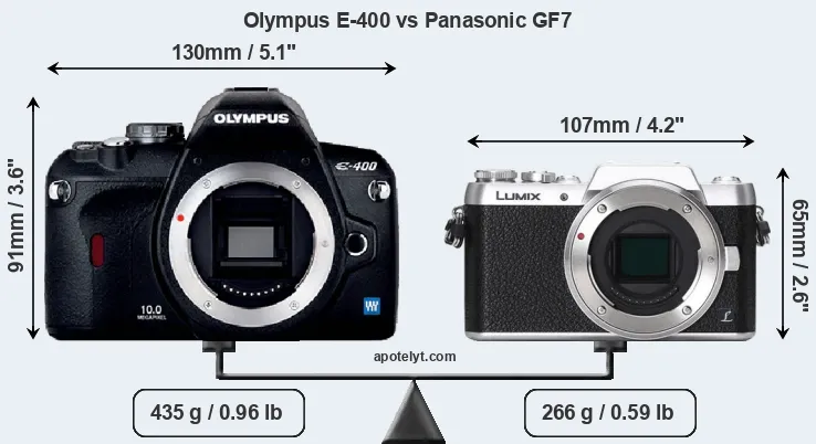 If the front view area (width x height) of the cameras is taken as an aggregate measure of their size, the Panasonic GF7 is considerably smaller (41 percent) than the Olympus E-400. Moreover, the GF7 is substantially lighter (39 percent) than the E-400. In this context, it is worth noting that neither the E-400 nor the GF7 are weather-sealed.