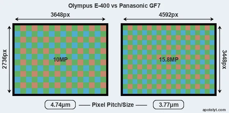 While the two cameras under review share the same sensor size, the GF7 offers a higher resolution of 15.8 megapixels, compared with 10 MP of the E-400. This megapixels advantage translates into a 26 percent gain in linear resolution. On the other hand, these sensor specs imply that the GF7 has a higher pixel density and a smaller size of the individual pixel (with a pixel pitch of 3.77μm versus 4.74μm for the E-400). However, it should be noted that the GF7 is much more recent (by 8 years and 4 months) than the E-400, and its sensor will have benefitted from technological advances during this time that compensate for the smaller pixel size.
