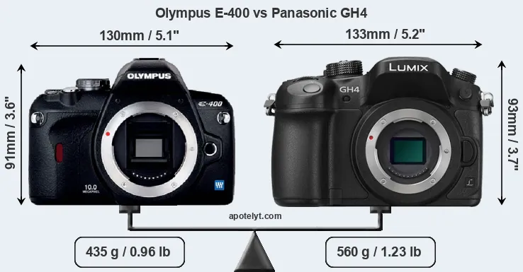 The side-by-side display below illustrates the physical size and weight of the Olympus E-400 and the Panasonic GH4. The two cameras are presented according to their relative size. Three consecutive perspectives from the front, the top, and the back are available. All width, height and depth dimensions are rounded to the nearest millimeter.