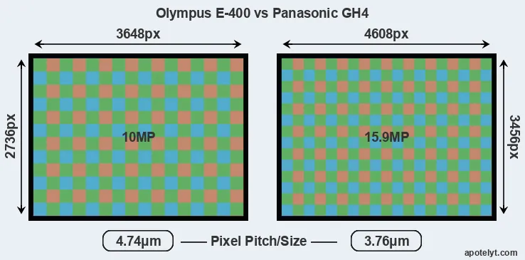 While the two cameras under review share the same sensor size, the GH4 offers a higher resolution of 15.9 megapixels, compared with 10 MP of the E-400. This megapixels advantage translates into a 26 percent gain in linear resolution. On the other hand, these sensor specs imply that the GH4 has a higher pixel density and a smaller size of the individual pixel (with a pixel pitch of 3.76μm versus 4.74μm for the E-400). However, it should be noted that the GH4 is much more recent (by 7 years and 4 months) than the E-400, and its sensor will have benefitted from technological advances during this time that compensate for the smaller pixel size.