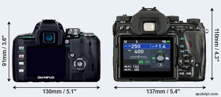 The side-by-side display below illustrates the physical size and weight of the Olympus E-400 and the Pentax K-1 II. The two cameras are presented according to their relative size. Three consecutive perspectives from the front, the top, and the back are available. All width, height and depth measures are rounded to the nearest millimeter.