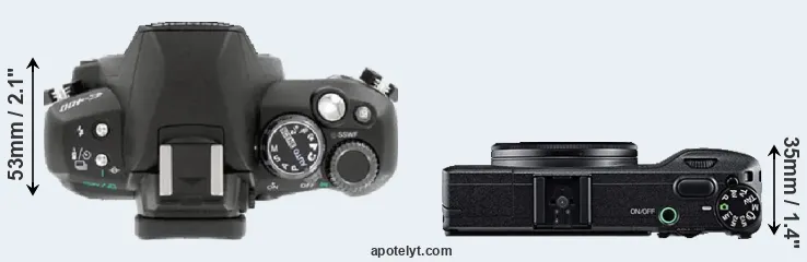 The above size and weight comparisons are to some extent incomplete and possibly misleading, as the GR has a lens built in, whereas the E-400 is an interchangeable lens camera that requires a separate lens. Attaching the latter will add extra weight and bulk to the setup. You can compare the optics available for the E-400 and their specifications in the Four Thirds Lens Catalog.