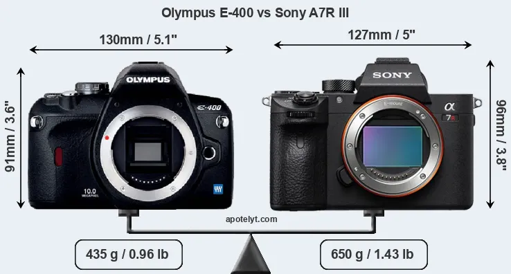 If the front view area (width x height) of the cameras is taken as an aggregate measure of their size, the Sony A7R III is somewhat larger (3 percent) than the Olympus E-400. Moreover, the A7R III is substantially heavier (49 percent) than the E-400. It is noteworthy in this context that the A7R III is splash and dust-proof, while the E-400 does not feature any corresponding weather-sealing.