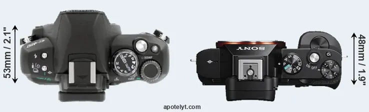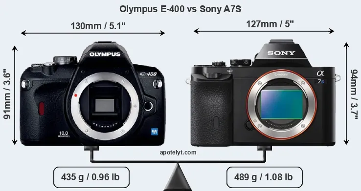 If the front view area (width x height) of the cameras is taken as an aggregate measure of their size, the Olympus E-400 and the Sony A7S are of equal size. However, the A7S is markedly heavier (12 percent) than the E-400. It is noteworthy in this context that the A7S is splash and dust-proof, while the E-400 does not feature any corresponding weather-sealing.