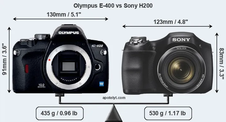 An illustration of the physical size and weight of the Olympus E-400 and the Sony H200 is provided in the side-by-side display below. The two cameras are presented according to their relative size. Three consecutive perspectives from the front, the top, and the back are available. All width, height and depth dimensions are rounded to the nearest millimeter.