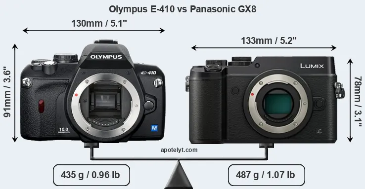 If the front view area (width x height) of the cameras is taken as an aggregate measure of their size, the Panasonic GX8 is notably smaller (12 percent) than the Olympus E-410. However, the GX8 is markedly heavier (12 percent) than the E-410. It is noteworthy in this context that the GX8 is splash and dust-proof, while the E-410 does not feature any corresponding weather-sealing.
