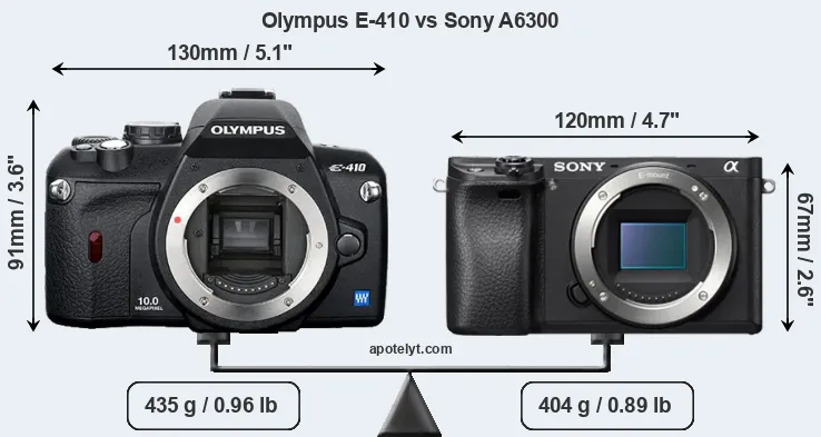 If the front view area (width x height) of the cameras is taken as an aggregate measure of their size, the Sony A6300 is considerably smaller (32 percent) than the Olympus E-410. Moreover, the A6300 is markedly lighter (7 percent) than the E-410. It is noteworthy in this context that the A6300 is splash and dust-proof, while the E-410 does not feature any corresponding weather-sealing.