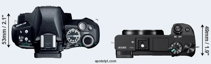 The physical size and weight of the Olympus E-410 and the Sony A6300 are illustrated in the side-by-side display below. The two cameras are presented according to their relative size. Three consecutive perspectives from the front, the top, and the back are available. All width, height and depth dimensions are rounded to the nearest millimeter.
