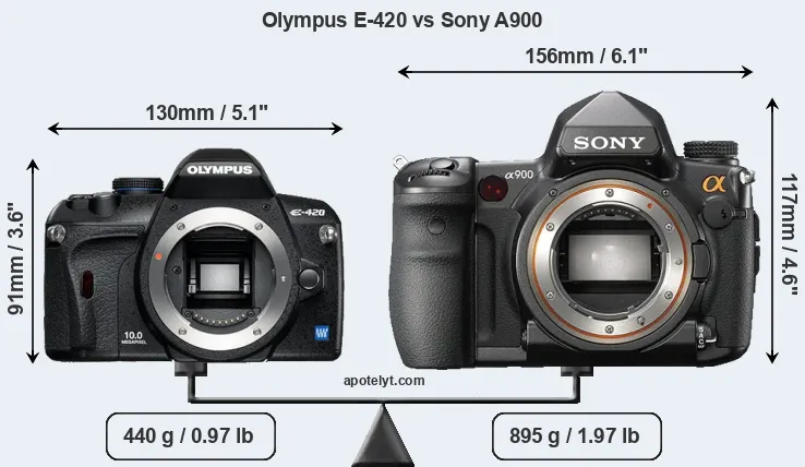 If the front view area (width x height) of the cameras is taken as an aggregate measure of their size, the Sony A900 is considerably larger (54 percent) than the Olympus E-420. Moreover, the A900 is substantially heavier (103 percent) than the E-420. It is noteworthy in this context that the A900 is splash and dust-proof, while the E-420 does not feature any corresponding weather-sealing.