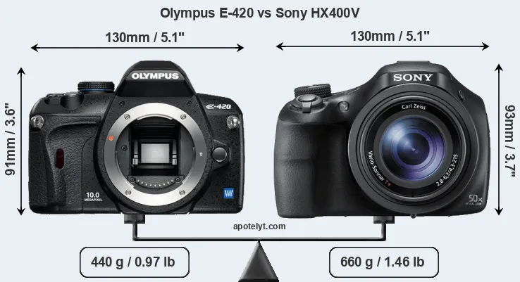 The above size and weight comparisons are to some extent incomplete and possibly misleading, as the HX400V has a lens built in, whereas the E-420 is an interchangeable lens camera that requires a separate lens. Attaching the latter will add extra weight and bulk to the setup. You can compare the optics available for the E-420 and their specifications in the Four Thirds Lens Catalog.