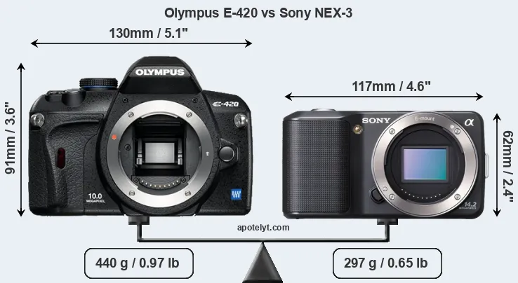 If the front view area (width x height) of the cameras is taken as an aggregate measure of their size, the Sony NEX-3 is considerably smaller (39 percent) than the Olympus E-420. Moreover, the NEX-3 is markedly lighter (33 percent) than the E-420. In this context, it is worth noting that neither the E-420 nor the NEX-3 are weather-sealed.