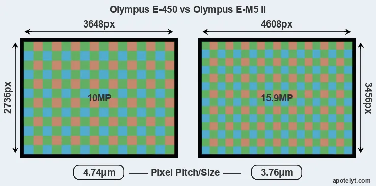 While the two cameras under review share the same sensor size, the E-M5 II offers a higher resolution of 15.9 megapixels, compared with 10 MP of the E-450. This megapixels advantage translates into a 26 percent gain in linear resolution. On the other hand, these sensor specs imply that the E-M5 II has a higher pixel density and a smaller size of the individual pixel (with a pixel pitch of 3.76μm versus 4.74μm for the E-450). However, it should be noted that the E-M5 II is much more recent (by 5 years and 10 months) than the E-450, and its sensor will have benefitted from technological advances during this time that compensate for the smaller pixel size.