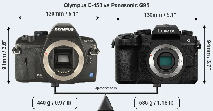 If the front view area (width x height) of the cameras is taken as an aggregate measure of their size, the Panasonic G95 is somewhat larger (3 percent) than the Olympus E-450. Moreover, the G95 is markedly heavier (22 percent) than the E-450. It is noteworthy in this context that the G95 is splash and dust-proof, while the E-450 does not feature any corresponding weather-sealing.