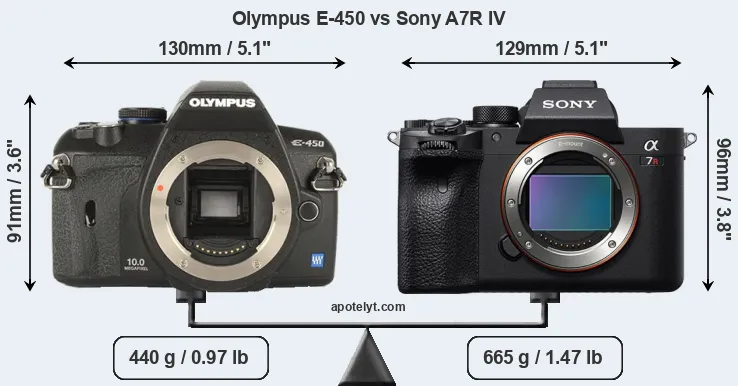 An illustration of the physical size and weight of the Olympus E-450 and the Sony A7R IV is provided in the side-by-side display below. The two cameras are presented according to their relative size. Three successive views from the front, the top, and the rear are shown. All width, height and depth dimensions are rounded to the nearest millimeter.