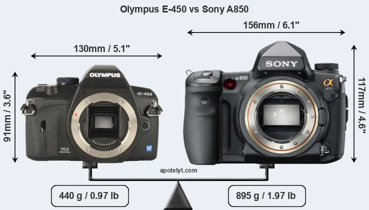 If the front view area (width x height) of the cameras is taken as an aggregate measure of their size, the Sony A850 is considerably larger (54 percent) than the Olympus E-450. Moreover, the A850 is substantially heavier (103 percent) than the E-450. It is noteworthy in this context that the A850 is splash and dust-proof, while the E-450 does not feature any corresponding weather-sealing.