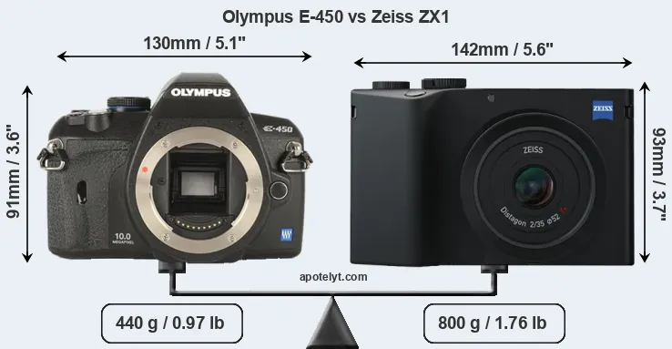 If the front view area (width x height) of the cameras is taken as an aggregate measure of their size, the Zeiss ZX1 is notably larger (12 percent) than the Olympus E-450. In this context, it is worth noting that neither the E-450 nor the ZX1 are weather-sealed.