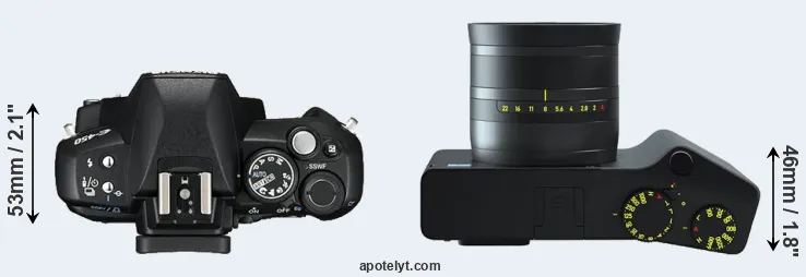 The side-by-side display below illustrates the physical size and weight of the Olympus E-450 and the Zeiss ZX1. The two cameras are presented according to their relative size. Three consecutive views from the front, the top, and the rear side are shown. All width, height and depth measures are rounded to the nearest millimeter.