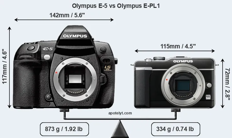 An illustration of the physical size and weight of the Olympus E-5 and the Olympus E-PL1 is provided in the side-by-side display below. The two cameras are presented according to their relative size. Three consecutive perspectives from the front, the top, and the back are available. All width, height and depth measures are rounded to the nearest millimeter.